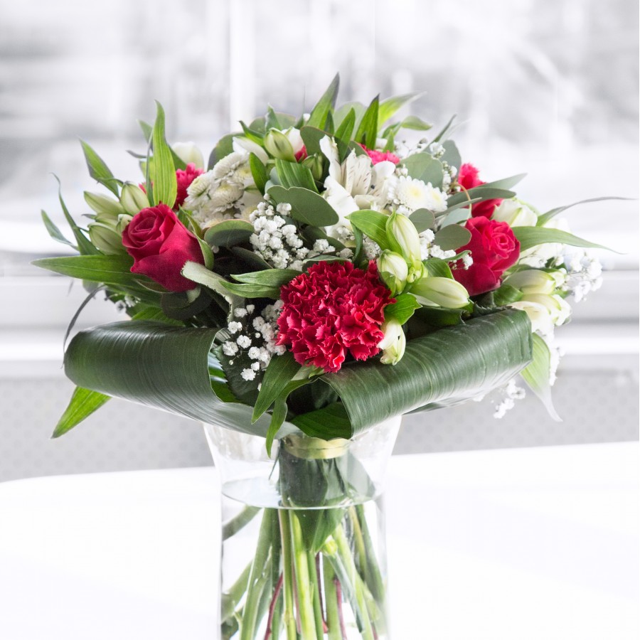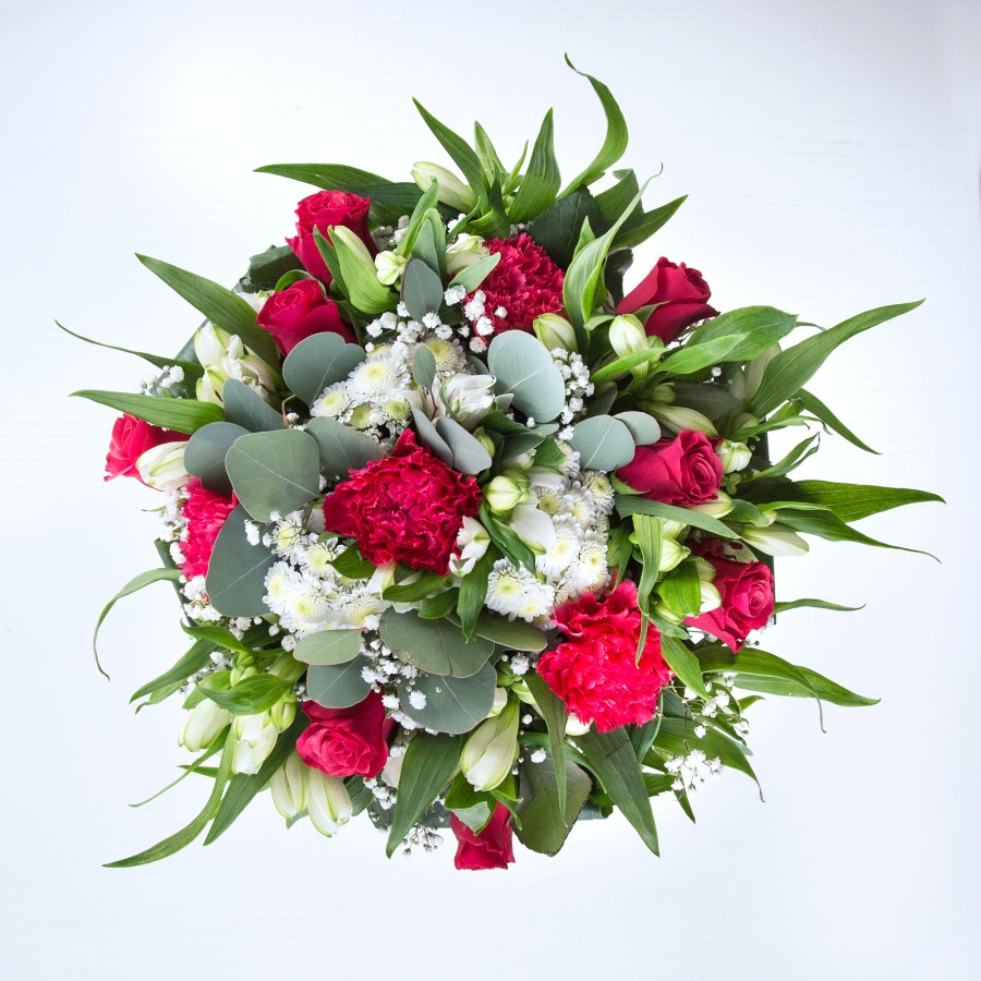 Discover unmatched beauty with our captivating bouquet, meticulously arranged to evoke warmth and elegance. Featuring a blend of delicate white chrysanthemums, ethereal gypsophila, striking red roses, and classic carnations, joined by white alstroemeria and lush aspidistra leaves, this arrangement pays tribute to nature’s splendor.